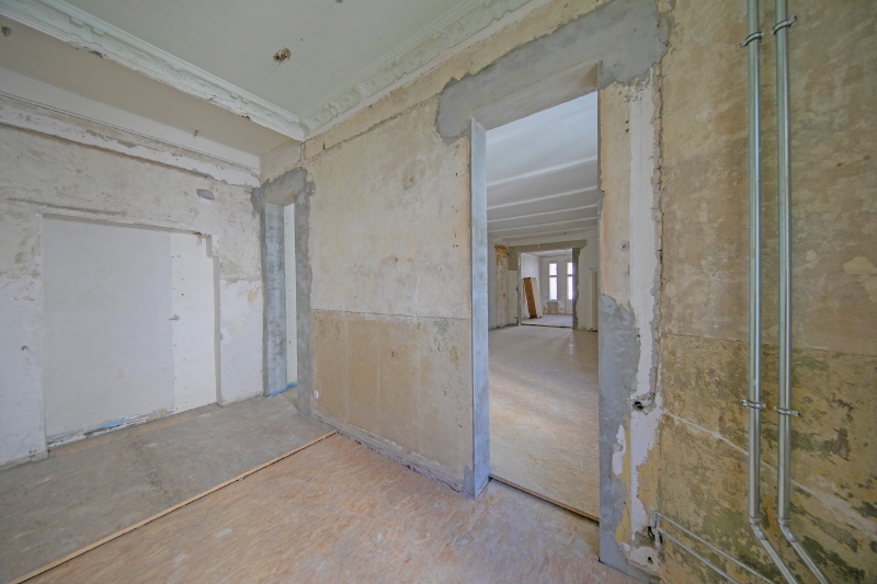 Die Sanierungsarbeiten in dieser herrschaftlichen Wohnung wurden bereits begonnen. Bad und Küche wurden entfernt, nicht tragende Wände, alte Einbauten und Böden ebenso.