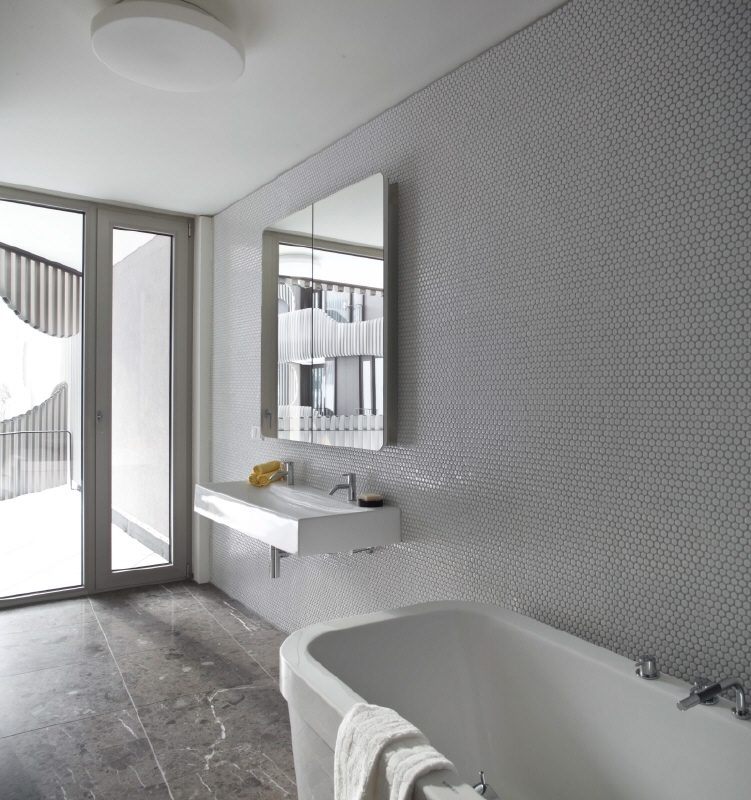 The large bathroom is an en-suite wellness bathroom with a large floor-to-ceiling window to the terrace, a bathtub and a threshold-free shower.