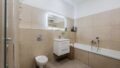 1 relativ großes Badezimmer mit Feinsteinfliesen, Badewanne und Dusche. Hier befindet sich auch der Waschmaschinenanschluss.