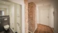 Das innenliegende Badezimmer hat eine Badewanne und ist mit anthrazit-Feinsteinfliesen ausgelegt.