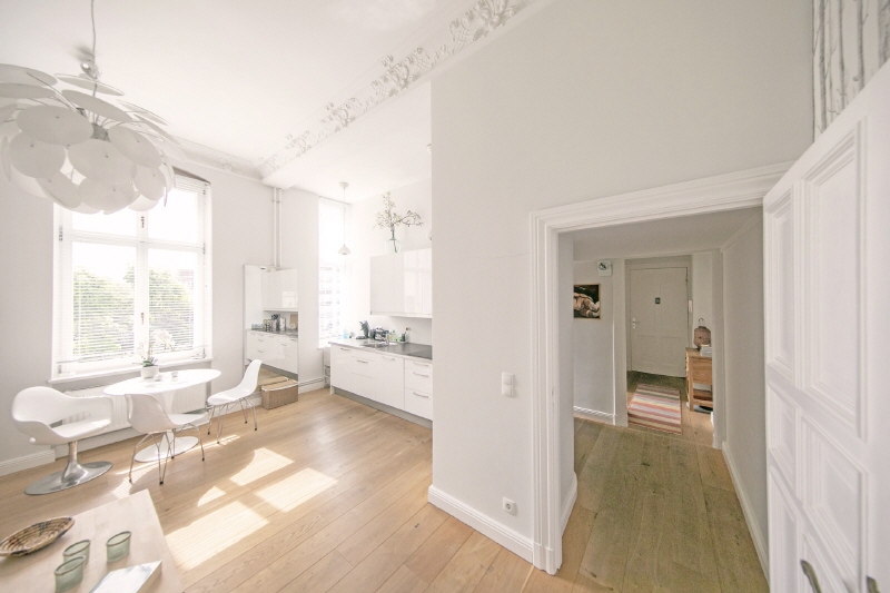 Glattputz an den Wänden. Vollholz-Eichen-Dielen in allen Räumen. Eine komplette Einbauküche mit allen Geräten, Geschirr und den notwendigen Küchen-Utensilien. Die Waschmaschine ist in der Küchenzeile integriert. Das Badezimmer hat eine schwellenfreie Dusche und Fenster. Im Bad wurde neben der "normalen" Beleuchtung auch ein indirektes farbiges Licht-Konzept in der Decke eingebaut. Die Fenster in der Wohnung sind nach Süd-Westen zum schönen Innenhof hin ausgerichtet. Mit Jalousien an den Fenstern.