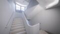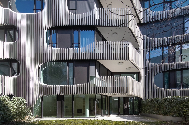 The unique and very elaborate façade is softly, three-dimensionally and sculpturally designed with countless vertical aluminum slats that also serve as sun protection.