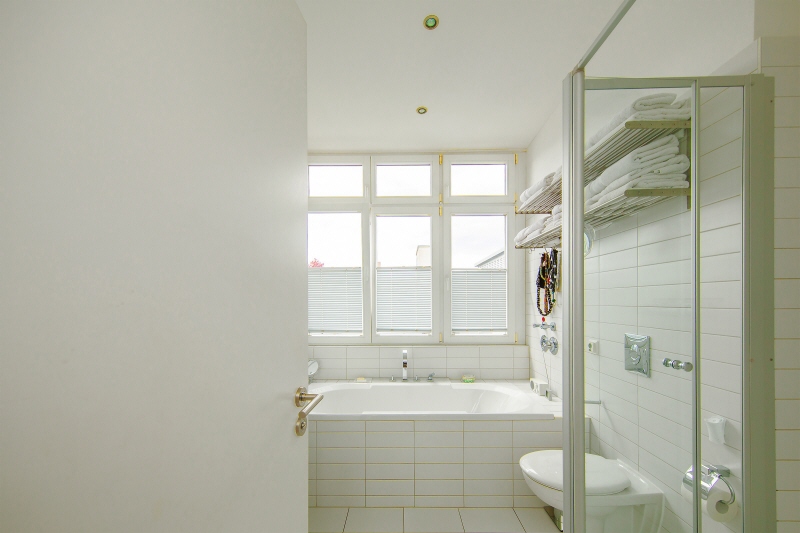 Das Badezimmer hat ein großes 3-flügeliges Fenster, eine Badewanne und eine Dusche. Eine Fußbodenheizung ist sowohl im Badezimmer als auch im Gast-WC verlegt.