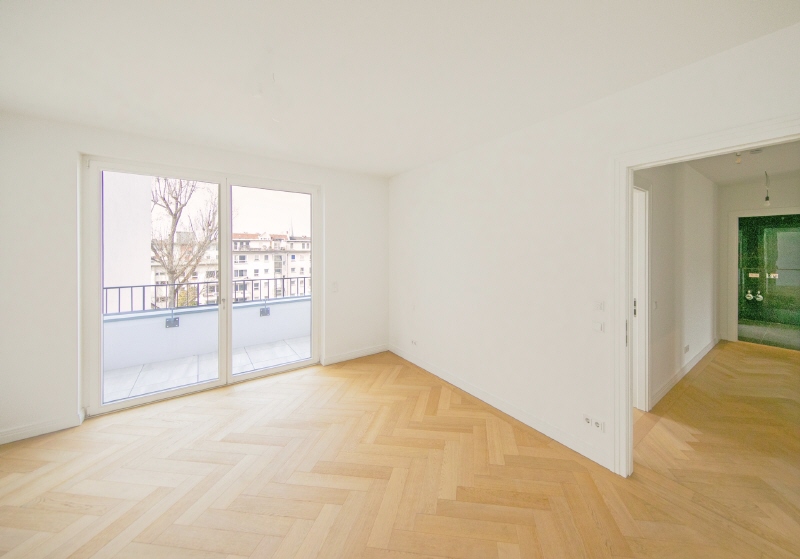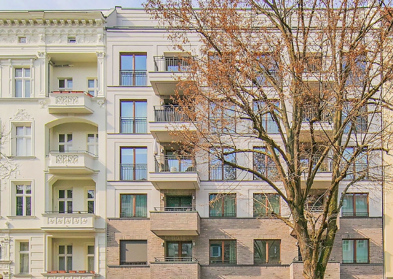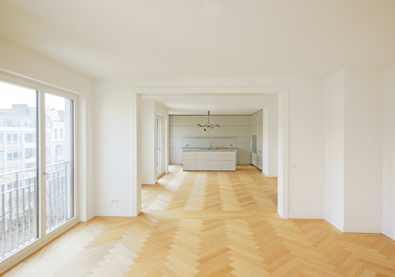 In the front building on the 5th floor, with floor-to-ceiling windows and 2 balconies facing Schlüterstraße, east-facing