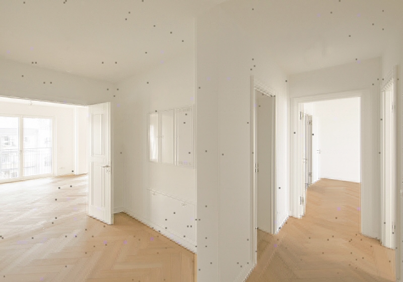 Bitte beachten Sie: Der dargestellte Grundriss mit 5 separaten Räumen zuzüglich einer abgeschlossenen Küche und dem separaten Hauswirtschaftsraum ist ein Vorschlag des Auftraggebers und grundsätzlich möglich und technisch umsetzbar. Die Flügeltüren und der Hauswirtschaftsraum ist in dem Ist-Zustand noch nicht realisiert.
