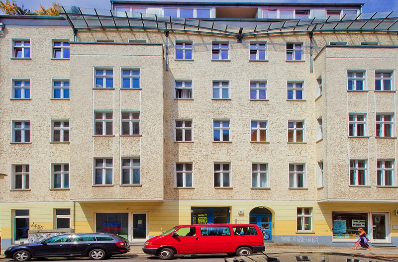 In der Choriner Straße, einer freundlichen verkehrsberuhigten Fahrradstraße mit viel Einzelhandel, Büroflächen und Gastro in den Erdgeschossen.