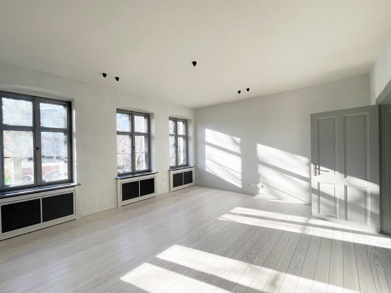 Bei der mit dem Denkmalamt Hand in Hand und aufwendigen Sanierung wurden, wo möglich, historische Elemente aufgerarbeitet, was der Wohnung den besonderen Charme verleiht.