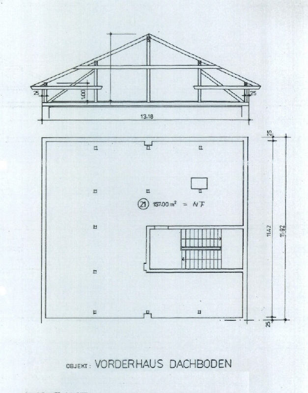 Der Dachboden hat eine Nutzfläche von ca. 157 qm im Ist-Zustand.