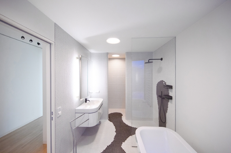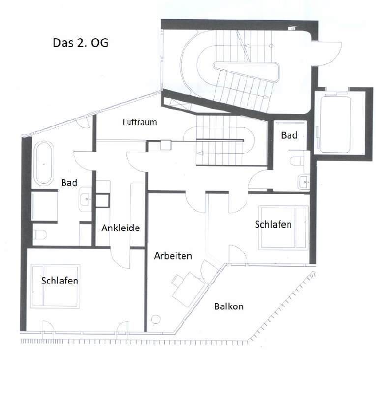We enter the apartment again, and via the beautiful connecting staircase to the 2nd floor we reach the private wing, which is connected to the living level by an atrium with over 6 m ceiling height. Here on the 2nd floor are currently 3 separate bedrooms. There is a shower room a large master bathroom with freestanding bathtub and shower. In the wide hallway is the dressing room (see floor plan).