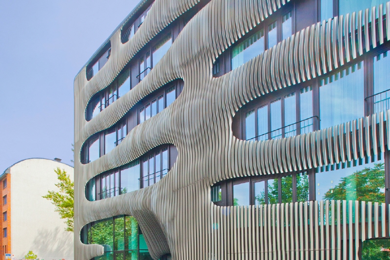 To the architecture of the building it should be mentioned that the Archiketkt, J.Mayer H., the facade skin in a unique form for Berlin, namely 3-dimensional, plastically designed, from countless vertical aluminum slats, which also serve as sun protection.