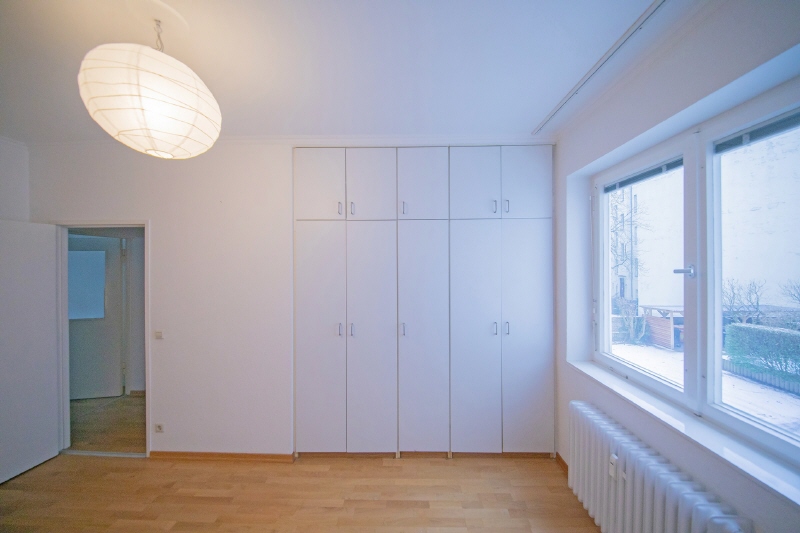 These two small, combined apartments are being sold with a relatively large south-facing balcony and a beautiful view of the street, directly onto Ludwigkirchplatz.