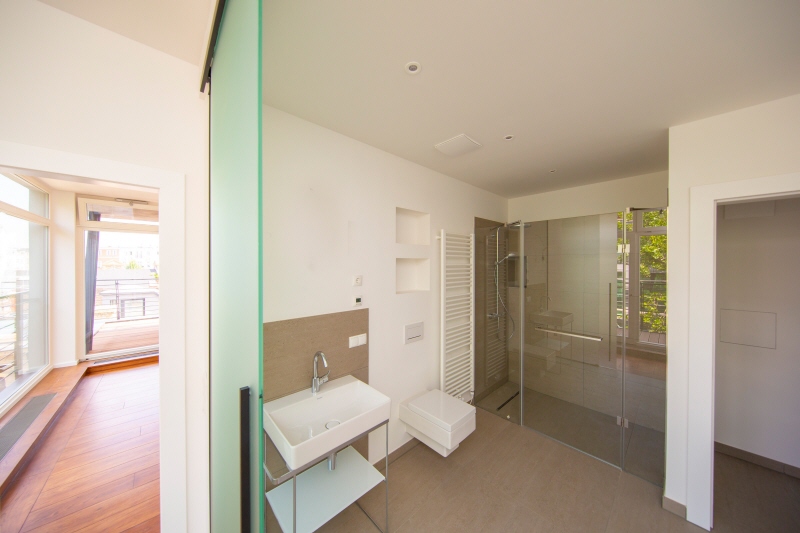 bodentiefe Holz-Isolierglas-Fenster in allen Räumen, außer im Gast-WC, hier ist ein Oberlicht eingebaut, welches sich elektrisch öffnen lässt. Das große Badezimmer ist mit einer Badewanne und schwellenfreien Dusche ausgestattet. Durch die große wattierte Glas-Schiebetür zum Bad kommt auch in das Hauptbadezimmer viel Licht.