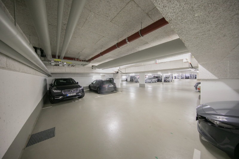 Die Tiefgarage erstreckt sich über mehrere Gebäude und ist sehr komfortabel über eine eigene Zufahrt und eine separate Ausfahrt zu befahren.