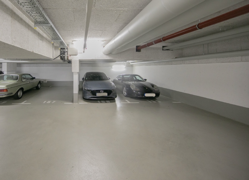 Die Tiefgarage erstreckt sich über mehrere Gebäude und ist sehr komfortabel über eine eigene Zufahrt und eine separate Ausfahrt zu befahren.