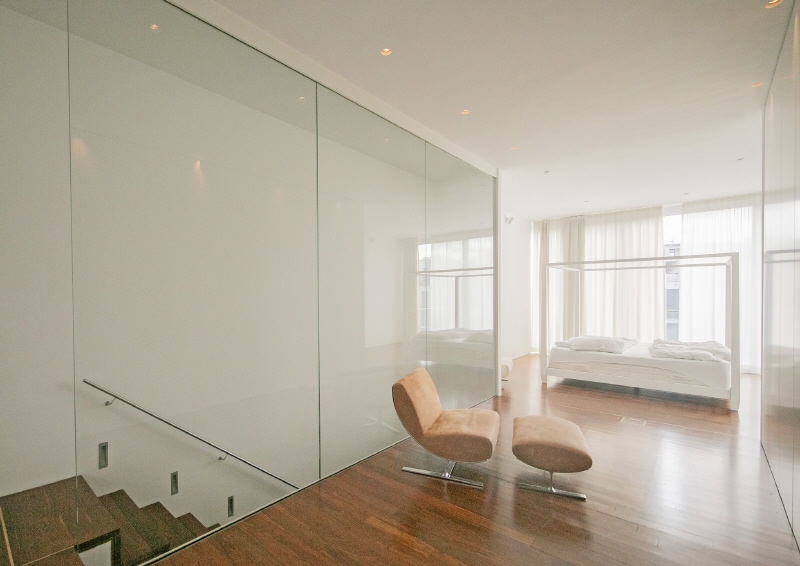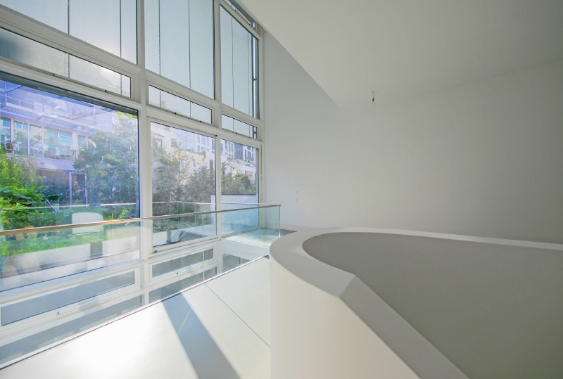 Die Wohnung: Eine organische geschwungene Treppe – oder ein Aufzug – führen vom linken Eingang in den zweiten Stock des Townhouses, in dem sich der Wohnbereich mit der offenen Küche sowie eine sich anschließende ca. 70 qm große Terrasse befinden. Die Bulthaupt-Küche ist mit Gaggenau- und Miele-Geräten ausgestattet.